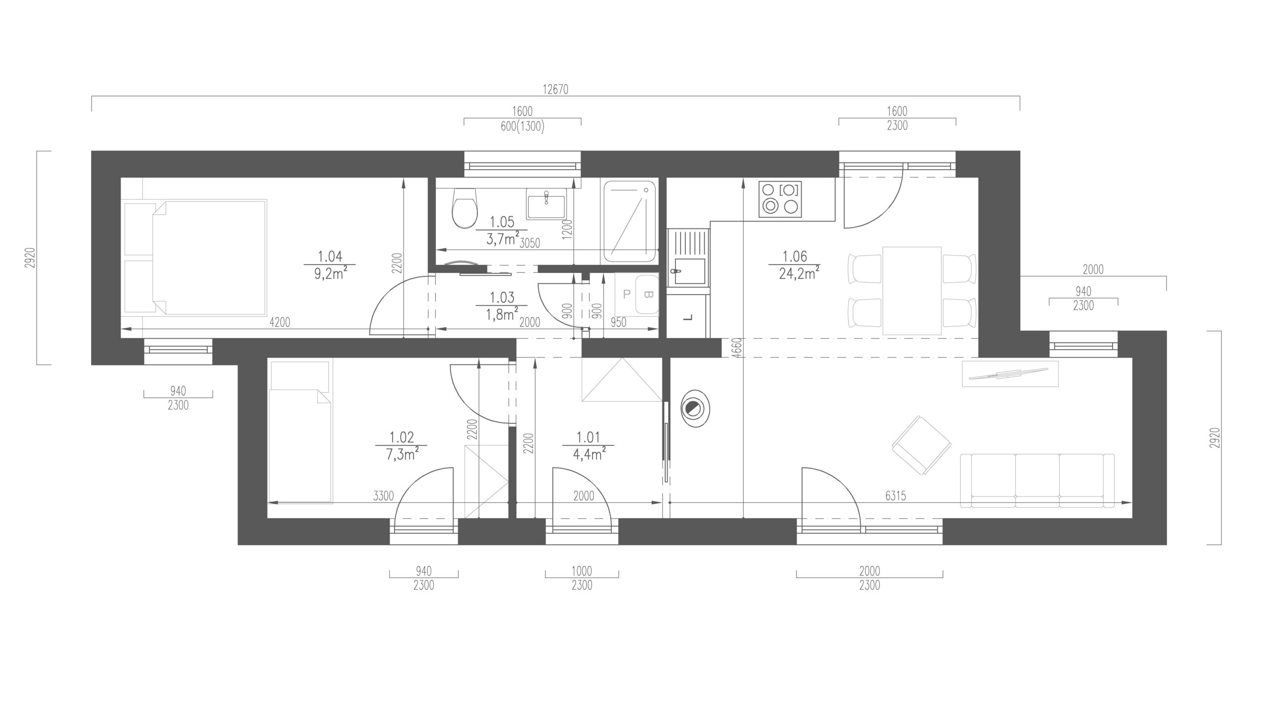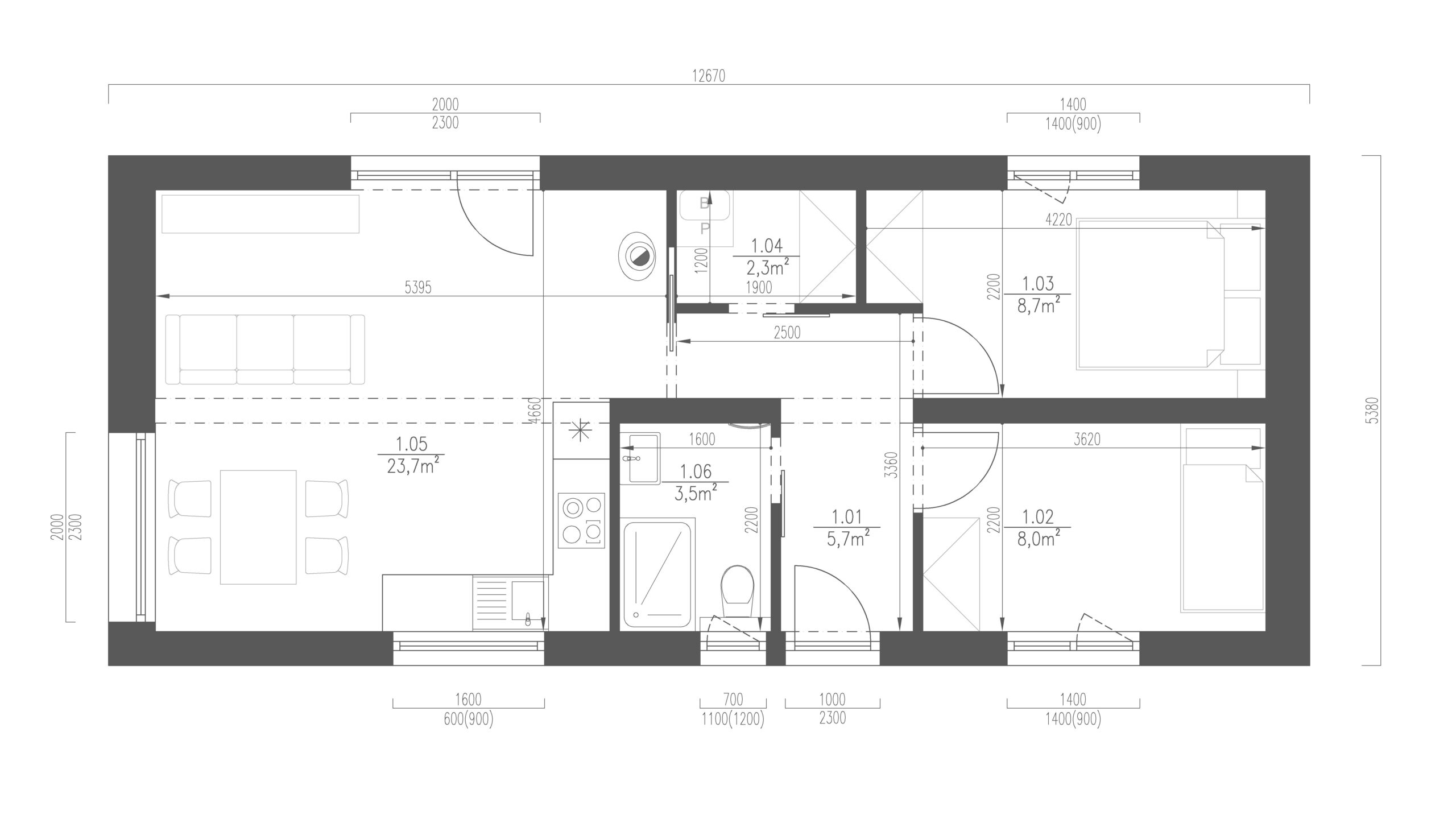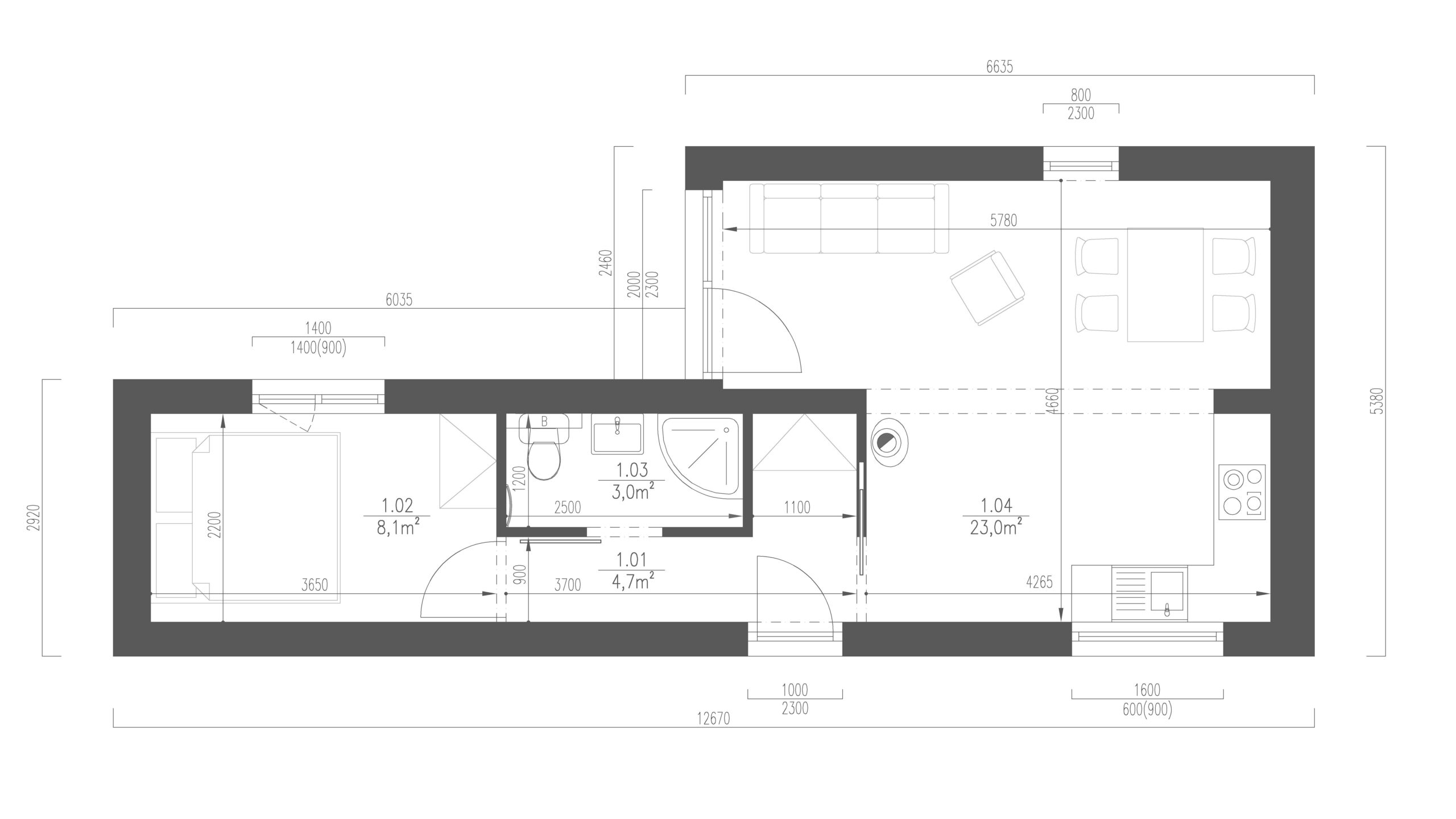 ModulCont 1 je modulární dům z upcyklovaného jednoho velkého lodního kontejneru HC40’. Včetně izolace a dřevěného obložení jsou vnější rozměry stavby 12,6 × 2,9 m.