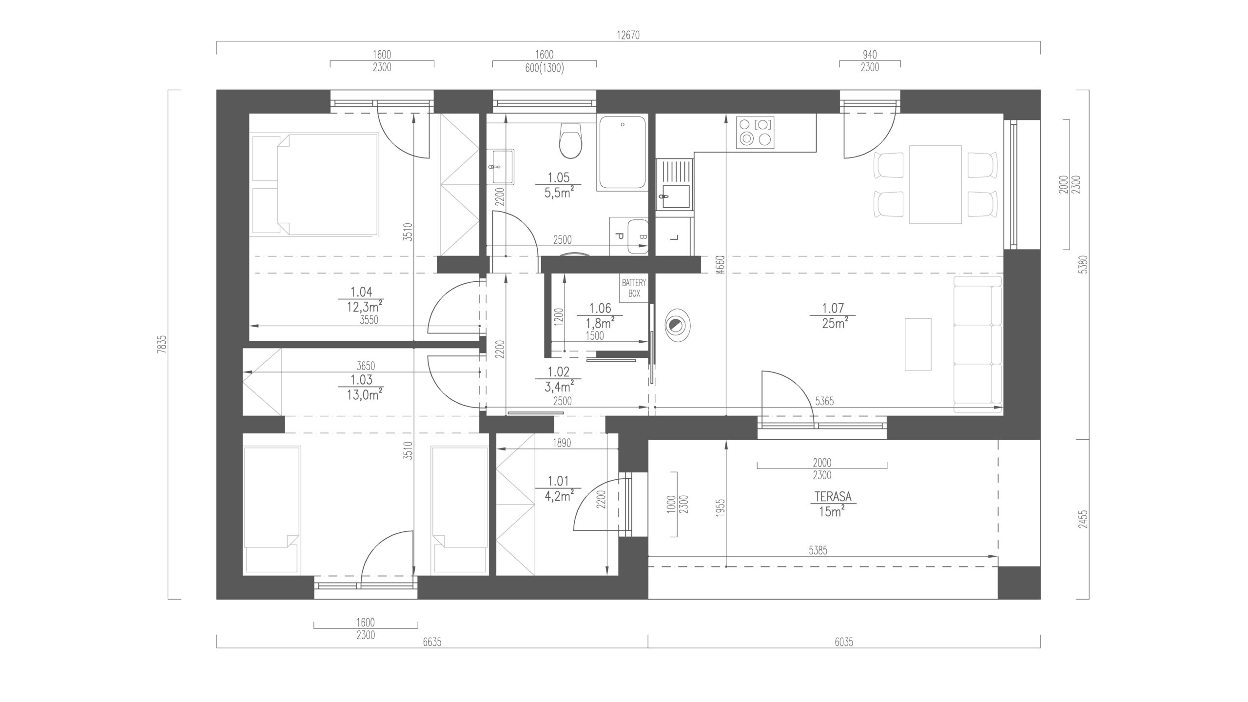 Jedná se o jednomodulovou stavbu, která od nás z výrobního dvora odjíždí na pozemek klienta již přibližně z 95 % dokončená. Díky tomu je instalace rychlá a zatížení pozemku klienta minimální. V případě potřeby lze dům poměrně snadno v budoucnu přemístit na jiné místo.